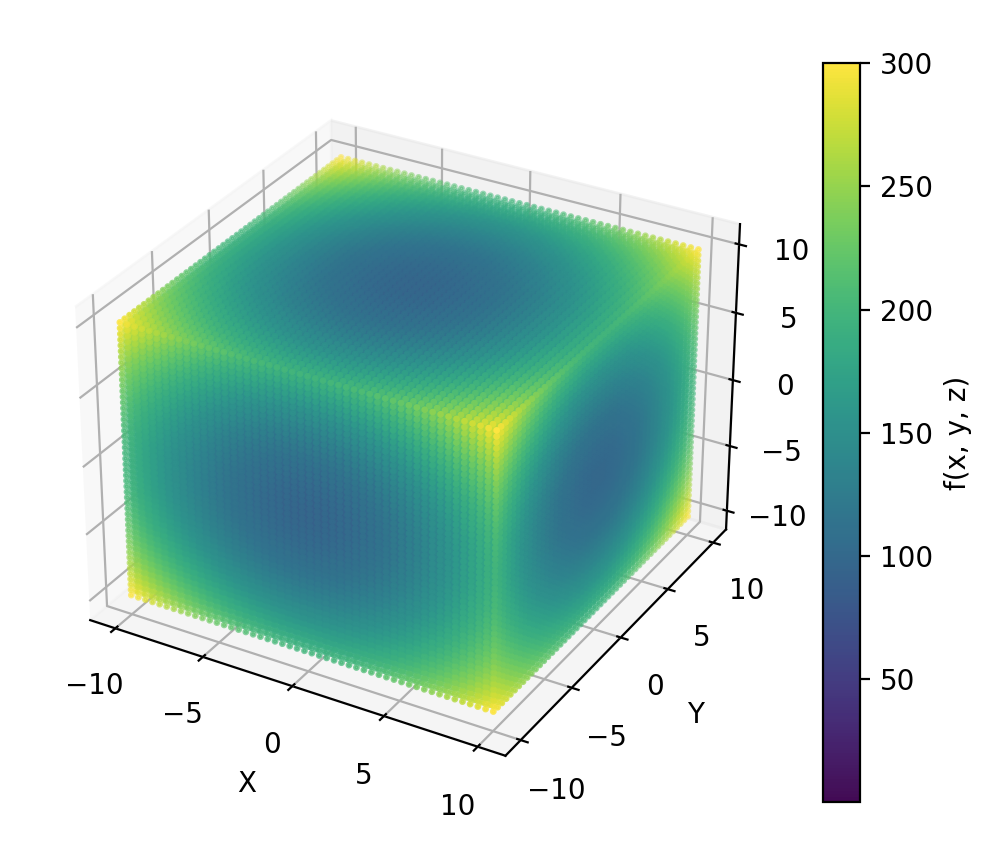 6. code 설명 및 결과: 3D 스칼라 함수 f(x, y, z)를 시각화하는 예제입니다. 여기서는 f(x, y, z) = x^2 + y^2 + z^2 라는 간단한 함수를 사용하였습니다. 이 예제에서는 Matplotlib와 NumPy 라이브러리를 사용하여 그래프를 생성합니다. f(x, y, z) = x^2 + y^2 + z^2 의 값을 3D 공간에 색상으로 표시한 그래프를 생성합니다. 범례(컬러바)는 f(x, y, z) 값을 나타내며, X, Y, Z 레이블이 각 축에 표시됩니다